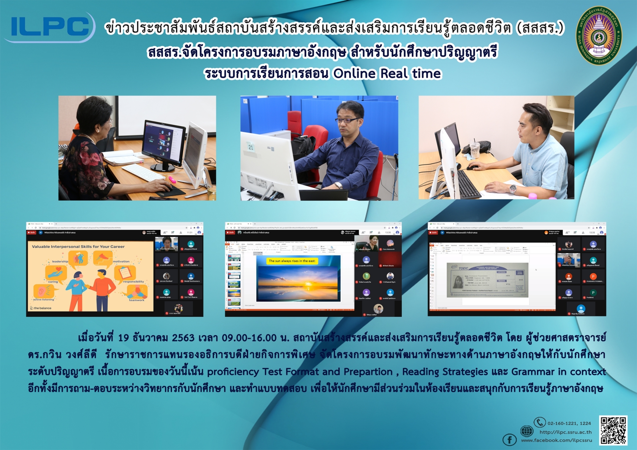 December 19, 2020, Institution of Lifelong Learning Promotion and Creativity by Director Dr. Kevin Wongleedee, Acting Vice President of Special Affair, offers a special training for undergraduate student in main campus. In this important training, many special trainers are responsible for the teaching and training the English communication in the areas of speaking, explaining the context of comprehension, and the focus is on English proficiency test and format as well as preparation, reading strategies, and grammar in context. There are a lot of questions and answers during the training to enhance the level of participation from students to learn English.