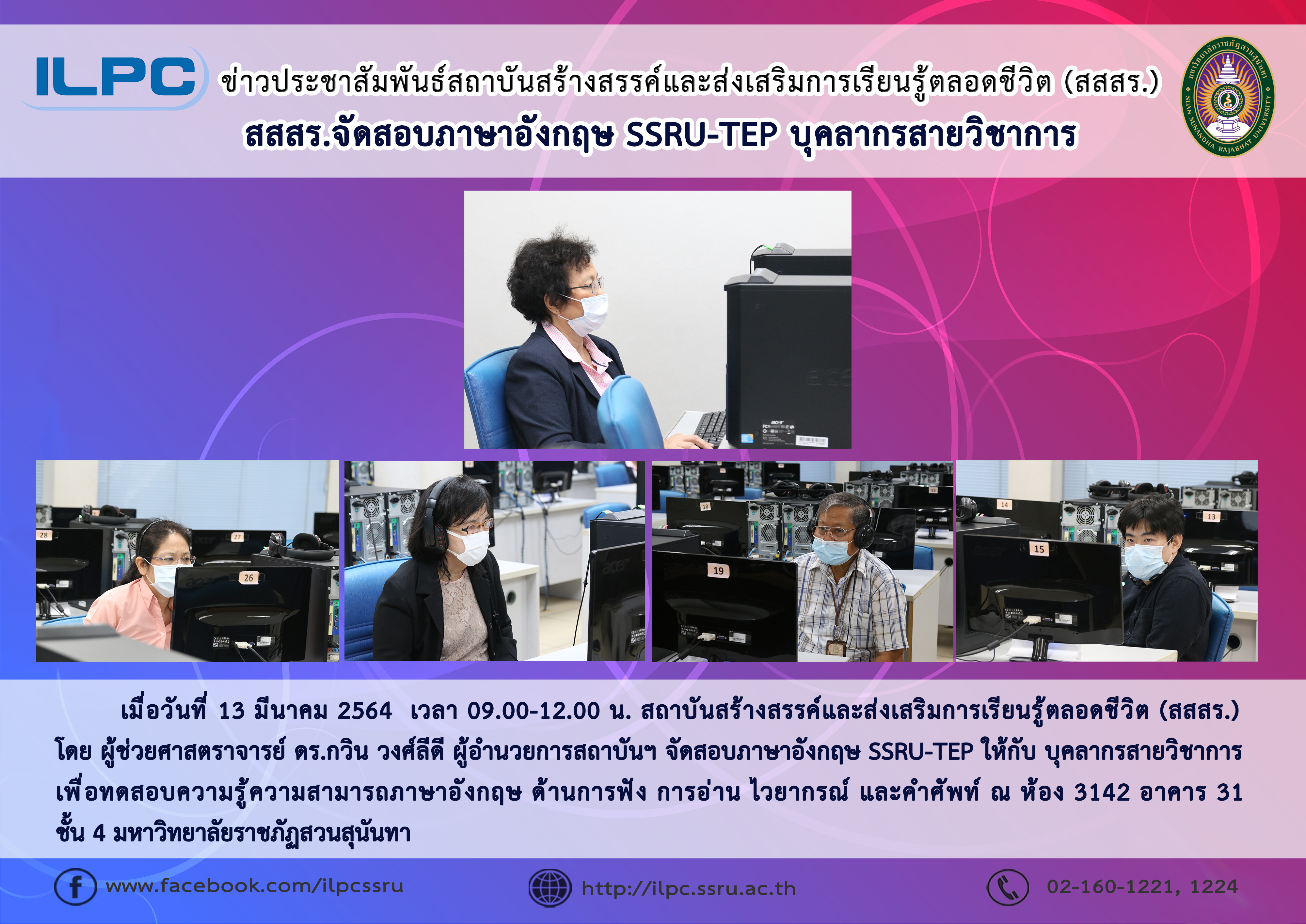 On March 13th, 2021, Institution of Lifelong Learning Promotion and Creativity, Asst. Prof. Dr. Kevin Wongleedee, Director of ILPC has offered the SSRU-TEP test for staff members to ensure that they have sufficiency knowledge of English in areas of listening, gramma, comprehension, and vocabs at room 3142, 4th Floor, Building 31.