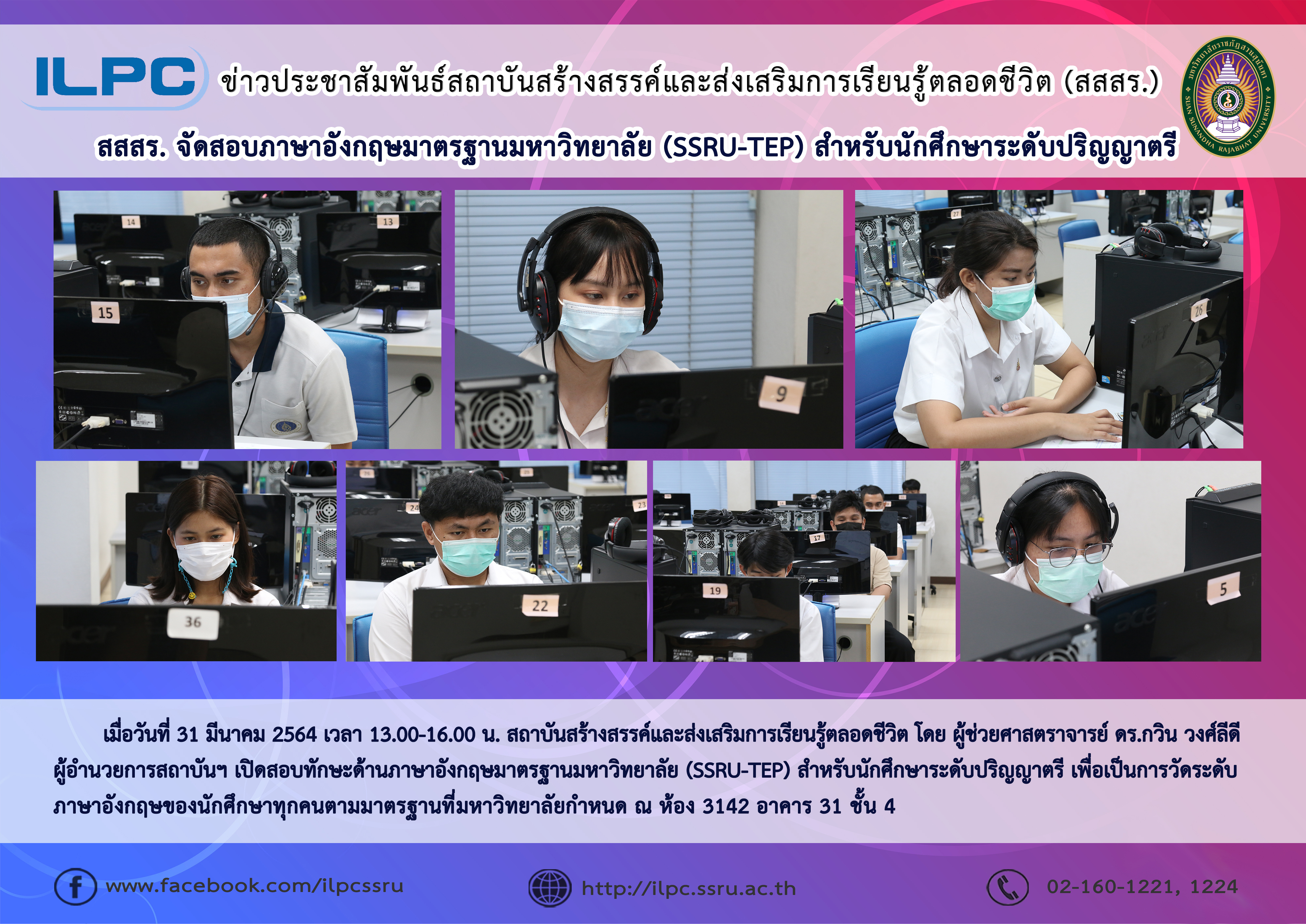 On March 31th, 2021, Institution of Lifelong Learning Promotion and Creativity, Asst. Prof. Dr. Kevin Wongleedee, Director of ILPC has offered a special day for SSRU-TEP test for undergraduate students to ensure that they have sufficiency knowledge of English in areas of listening, gramma, comprehension, and vocabs at room 3142, 4th Floor, Building 31.