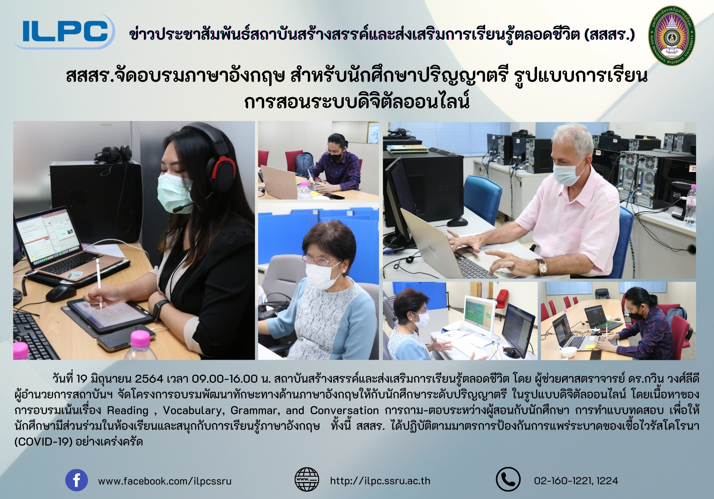 June 19, 2021, Asst. Prof. Dr. Kevin Wongleedee, Director of ILPC, offers a special course of English training online and visits and monitors the online learning courses of English training for SSRU students during the pandemic of Covid19. The focus of online learning is to improve four skills which are listening, gramma, vocab, and reading in order to make it more appealing and interesting for both learners and trainers and to follow the guidelines of safety strictly.