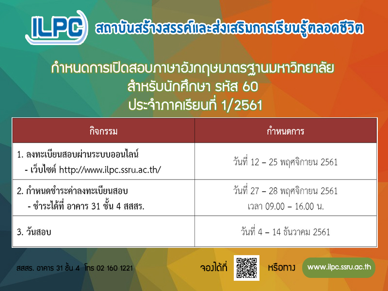 กำหนดการจัดสอบภาษาอังกฤษมาตรฐานมหาวิทยาลัยสำหรับนักศึกษาปริญญาตรี รหัส 60 ประจำภาคเรียนที่ 1/2561