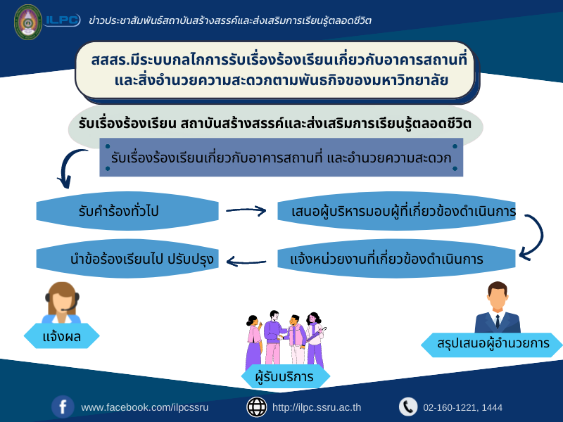 > สสสร.มีระบบกลไกการรับเรื่องร้องเรียนเกี่ยวกับอาคารสถานที่ และสิ่งอำนวยความสะดวกตามพันธกิจของมหาวิทยาลัย