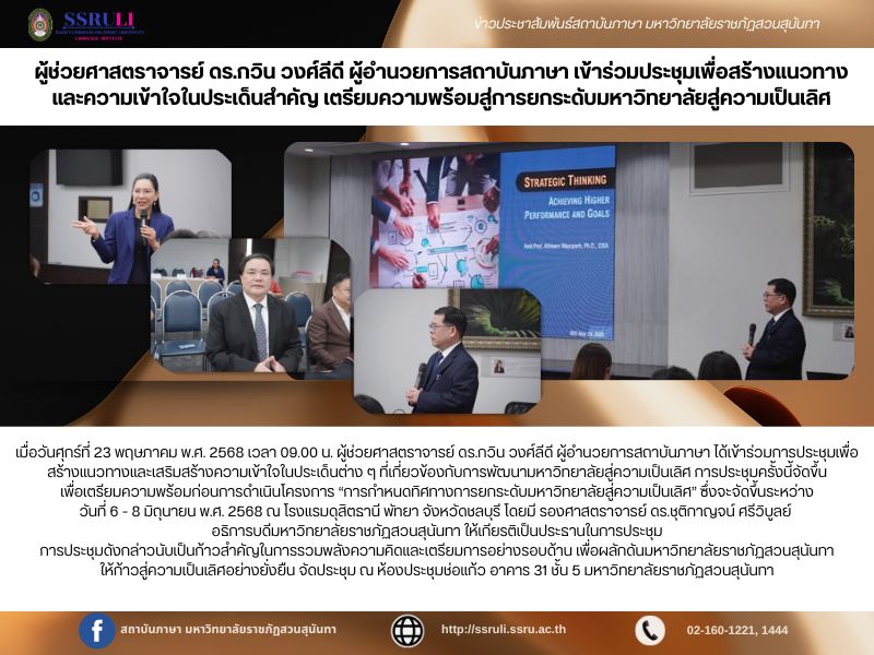เมื่อวันศุกร์ที่ 23 พฤษภาคม พ.ศ. 2568 เวลา 09.00 น. ผู้ช่วยศาสตราจารย์ ดร.กวิน วงศ์ลีดี ผู้อำนวยการสถาบันภาษา ได้เข้าร่วมการประชุมเพื่อสร้างแนวทางและเสริมสร้างความเข้าใจในประเด็นต่าง ๆ ที่เกี่ยวข้องกับการพัฒนามหาวิทยาลัยสู่ความเป็นเลิศ การประชุมครั้งนี้จัดขึ้น เพื่อเตรียมความพร้อมก่อนการดำเนินโครงการ “การกำหนดทิศทางการยกระดับมหาวิทยาลัยสู่ความเป็นเลิศ” ซึ่งจะจัดขึ้นระหว่างวันที่ 6 - 8 มิถุนายน พ.ศ. 2568 ณ โรงแรมดุสิตธานี พัทยา จังหวัดชลบุรี โดยมี รองศาสตราจารย์ ดร.ชุติกาญจน์ ศรีวิบูลย์ อธิการบดีมหาวิทยาลัยราชภัฏสวนสุนันทา ให้เกียรติเป็นประธานในการประชุม การประชุมดังกล่าวนับเป็นก้าวสำคัญในการรวมพลังความคิดและเตรียมการอย่างรอบด้าน เพื่อผลักดันมหาวิทยาลัยราชภัฏสวนสุนันทาให้ก้าวสู่ความเป็นเลิศอย่างยั่งยืน จัดประชุม ณ ห้องประชุมช่อแก้ว อาคาร 31 ชั้น 5 มหาวิทยาลัยราชภัฏสวนสุนันทา