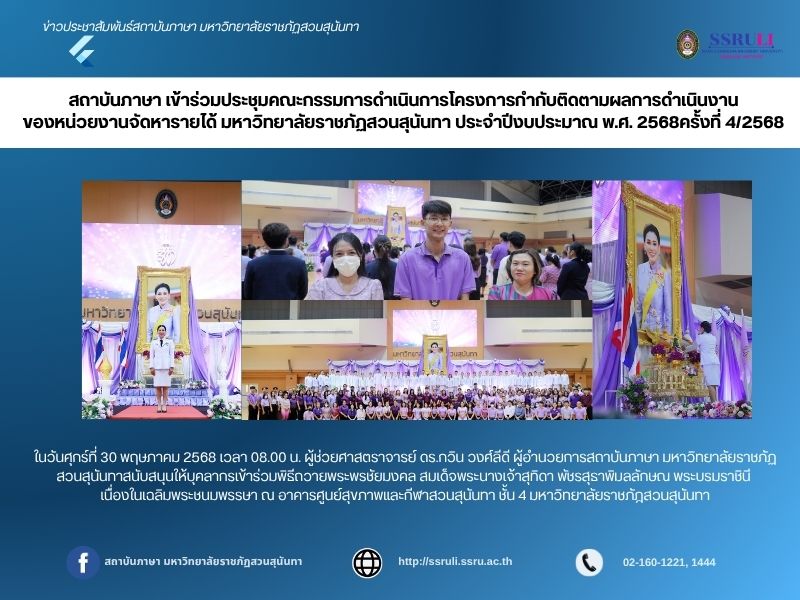 ในวันศุกร์ที่ 30 พฤษภาคม 2568 เวลา 08.00 น. ผู้ช่วยศาสตราจารย์ ดร.กวิน วงศ์ลีดี ผู้อำนวยการสถาบันภาษา มหาวิทยาลัยราชภัฏสวนสุนันทาสนับสนุนให้บุคลากรเข้าร่วมพิธีถวายพระพรชัยมงคล สมเด็จพระนางเจ้าสุทิดา พัชรสุธาพิมลลักษณ พระบรมราชินี เนื่องในเฉลิมพระชนมพรรษา ณ อาคารศูนย์สุขภาพและกีฬาสวนสุนันทา ชั้น 4 มหาวิทยาลัยราชภัฎสวนสุนันทา