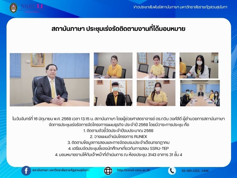ในวันจันทร์ที่ 16 มิถุนายน พ.ศ. 2568 เวลา 13.15 น. สถาบันภาษา โดยผู้ช่วยศาสตราจารย์ ดร.กวิน วงศ์ลีดี ผู้อำนวยการสถาบันภาษา จัดการประชุมเร่งรัดการจัดโครงการแผนธุรกิจ ประจำปี 2568 โดยมีวาระการประชุม คือ