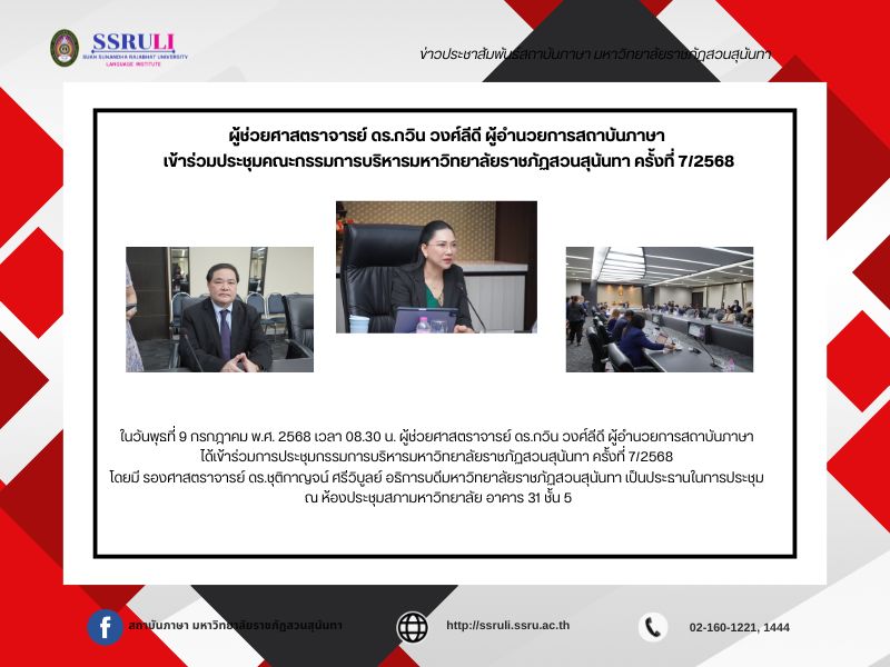 ผู้ช่วยศาสตราจารย์ ดร.กวิน วงศ์ลีดี ผู้อำนวยการสถาบันภาษา เข้าร่วมประชุมคณะกรรมการบริหารมหาวิทยาลัยราชภัฏสวนสุนันทา ครั้งที่ 7/2568