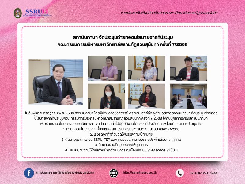 สถาบันภาษา จัดประชุมถ่ายทอดนโยบายจากที่ประชุมคณะกรรมการบริหารมหาวิทยาลัยราชภัฏสวนสุนันทา ครั้งที่ 7/2568