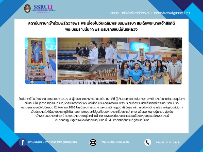 ในวันศุกร์ที่ 8 สิงหาคม 2568 เวลา 08.00 น. ผู้ช่วยศาสตราจารย์ ดร.กวิน วงศ์ลีดี ผู้อำนวยการสถาบันภาษา มหาวิทยาลัยราชภัฏสวนสุนันทา สนับสนุนให้บุคลากรสถาบันภาษา เข้าร่วมพิธีถวายพระพรเนื่องในวันเฉลิมพระชนมพรรษา สมเด็จพระนางเจ้าสิริกิติ์ พระบรมราชินีนาถ พระบรมราชชนนีพันปีหลวง 12 สิงหาคม 2568 โดยมีรองศาสตราจารย์ ดร.ชุติกาญจน์ ศรีวิบูลย์ อธิการบดีมหาวิทยาลัยราชภัฏสวนสุนันทา เป็นประธานในพิธีถวายราชสดุดี เปิดกรวยกระทงดอกไม้ธูปเทียนแพถวายเครื่องราชสักการะ พร้อมวางพานพุ่มทอง พุ่มเงิน หน้าพระบรมฉายาลักษณ์ กล่าวถวายราชสดุดี กล่าวนำถวายพระพรชัยมงคล และร่วมร้องเพลงสรรเสริญพระบารมี ณ อาคารศูนย์สุขภาพและกีฬาสวนสุนันทา ชั้น 4 มหาวิทยาลัยราชภัฏสวนสุนันทา