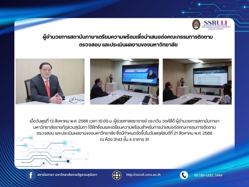 เมื่อวันพุธที่ 13 สิงหาคม พ.ศ. 2568 เวลา 10.00 น. ผู้ช่วยศาสตราจารย์ ดร.กวิน วงศ์ลีดี ผู้อำนวยการสถาบันภาษา มหาวิทยาลัยราชภัฏสวนสุนันทา ได้ฝึกซ้อมและเตรียมความพร้อมสำหรับการนำเสนอต่อคณะกรรมการติดตาม ตรวจสอบ และประเมินผลงานของมหาวิทยาลัย ซึ่งมีกำหนดจัดขึ้นในวันพฤหัสบดีที่ 21 สิงหาคม พ.ศ. 2568 ณ ห้อง 3143 ชั้น 4 อาคาร 31
