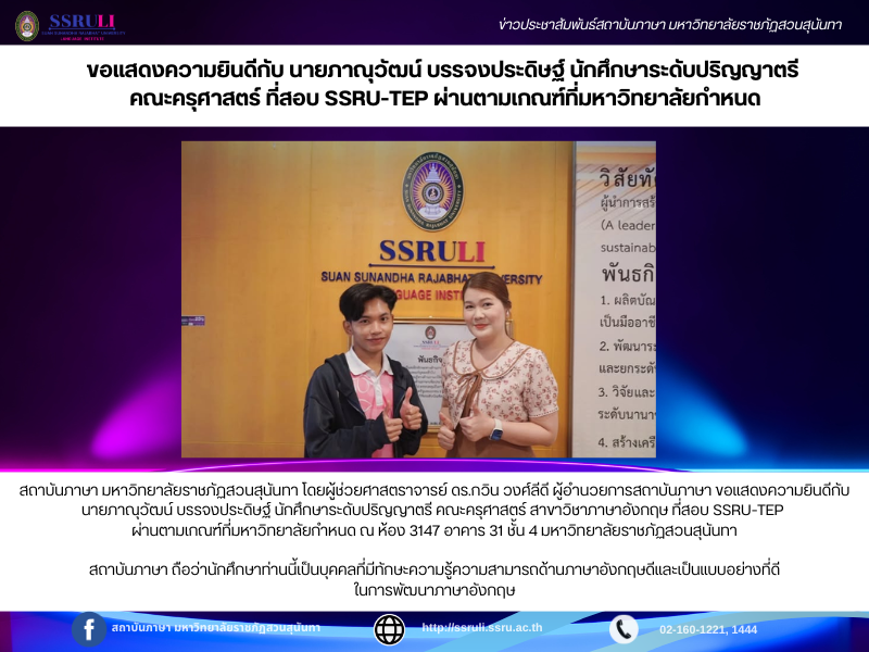 สถาบันภาษา มหาวิทยาลัยราชภัฏสวนสุนันทา โดยผู้ช่วยศาสตราจารย์ ดร.กวิน วงศ์ลีดี ผู้อำนวยการสถาบันภาษา ขอแสดงความยินดีกับ นายภาณุวัฒน์ บรรจงประดิษฐ์ นักศึกษาระดับปริญญาตรี คณะครุศาสตร์ สาขาวิชาภาษาอังกฤษ ที่สอบ SSRU-TEP