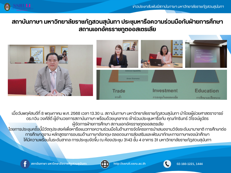 สถาบันภาษา มหาวิทยาลัยราชภัฏสวนสุนันทา ประชุมหารือความร่วมมือกับฝ่ายการศึกษา สถานเอกอัครราชทูตออสเตรเลีย