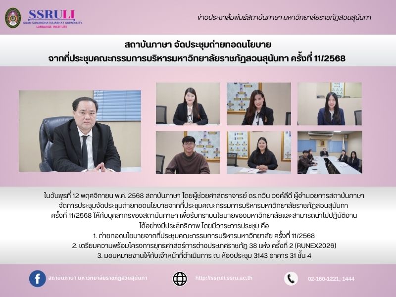 ในวันพุธที่ 12 พฤศจิกายน พ.ศ. 2568 สถาบันภาษา โดยผู้ช่วยศาสตราจารย์ ดร.กวิน วงศ์ลีดี ผู้อำนวยการสถาบันภาษา จัดการประชุมจัดประชุมถ่ายทอดนโยบายจากที่ประชุมคณะกรรมการบริหารมหาวิทยาลัยราชภัฏสวนสุนันทา ครั้งที่ 11/2568 ให้กับบุคลากรของสถาบันภาษา เพื่อรับทราบนโยบายของมหาวิทยาลัยและสามารถนำไปปฏิบัติงาน ได้อย่างมีประสิทธิภาพ โดยมีวาระการประชุม คือ