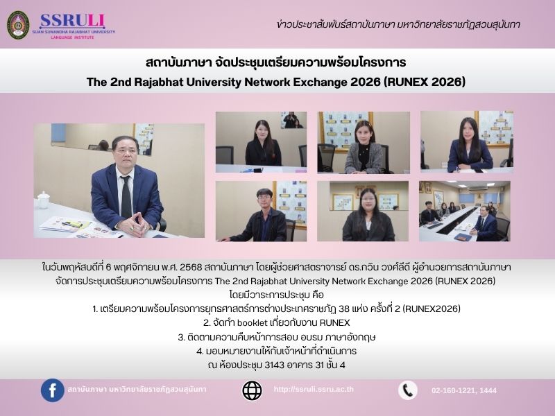ในวันพฤหัสบดีที่ 6 พฤศจิกายน พ.ศ. 2568 สถาบันภาษา โดยผู้ช่วยศาสตราจารย์ ดร.กวิน วงศ์ลีดี ผู้อำนวยการสถาบันภาษา จัดการประชุมเตรียมความพร้อมโครงการ The 2nd Rajabhat University Network Exchange 2026 (RUNEX 2026) โดยมีวาระการประชุม คือ