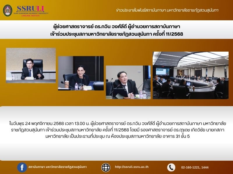 ในวันพุธ 24 พฤศจิกายน 2568 เวลา 13.00 น. ผู้ช่วยศาสตราจารย์ ดร.กวิน วงศ์ลีดี ผู้อำนวยการสถาบันภาษา มหาวิทยาลัยราชภัฏสวนสุนันทา เข้าร่วมประชุมสภามหาวิทยาลัย ครั้งที่ 11/2568 โดยมี รองศาสตราจารย์ ดร.ฤๅเดช เกิดวิชัย นายกสภามหาวิทยาลัย เป็นประธานที่ประชุม ณ ห้องประชุมสภามหาวิทยาลัย อาคาร 31 ชั้น 5