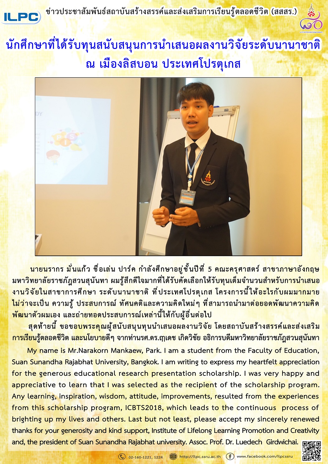 > นักศึกษาที่ได้รับทุนสนับสนุนการนำเสนอผลงานวิจัยระดับนานาชาติ ณ เมืองลิสบอน ประเทศโปรตุเกส