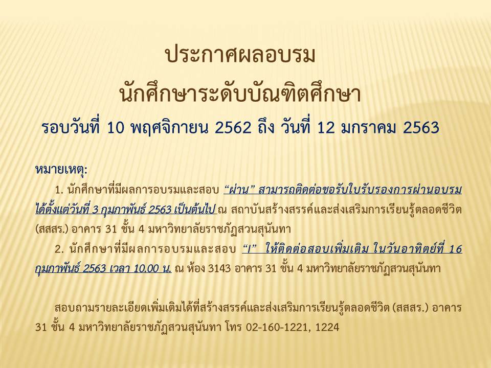 ประกาศผลอบรมและสอบนักศึกษาระดับบัณฑิตศึกษา รอบวันที่ 10 พฤศจิกายน 2562 - วันที่ 12 มกราคม 2563.pdf