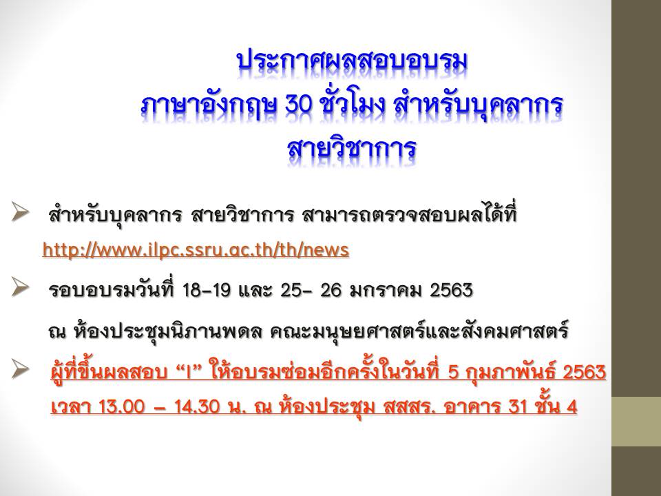 ประกาศผลอบรมภาษาอังกฤษสำหรับบุคลากรสายวิชาการ รอบวันที่ 18-19 และ 25-26 มกราคม 2563