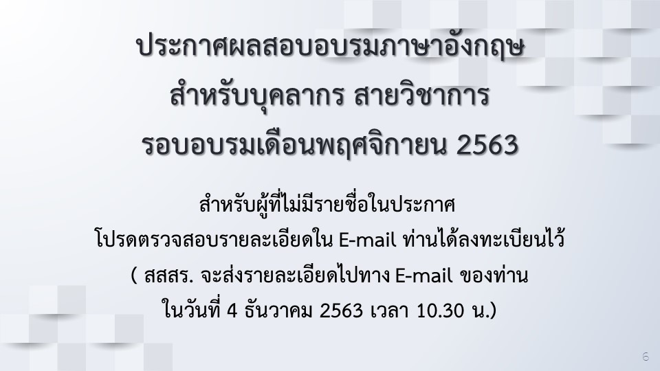 ประกาศผลอบรมภาษาอังกฤษสำหรับบุคลากรสายวิชาการ ประจำเดือน พฤศจิกายน 2563