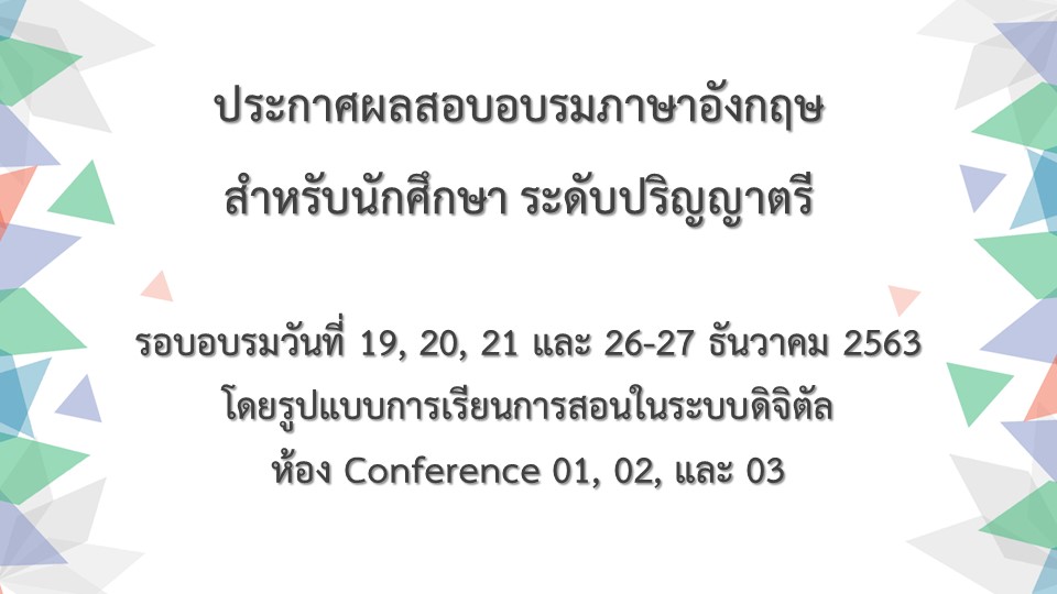 ประกาศผลอบรมภาษาอังกฤษสำหรับนักศึกษา ระดับปริญญาตรี รอบเดือน ธันวาคม 2563 (ห้อง 01)
