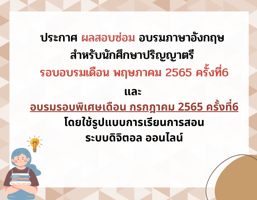 ประกาศ ผลสอบซ่อม อบรมภาษาอังกฤษ สำหรับนักศึกษาปริญญาตรี รอบอบรมเดือน พฤษภาคม 2565 ครั้งที่6 และ อบรมรอบพิเศษเดือน กรกฎาคม 2565 ครั้งที่6