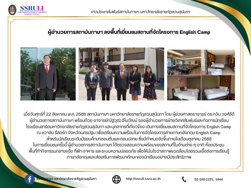 เมื่อวันศุกร์ที่ 22 สิงหาคม พ.ศ. 2568 สถาบันภาษา มหาวิทยาลัยราชภัฏสวนสุนันทา โดย ผู้ช่วยศาสตราจารย์ ดร.กวิน วงศ์ลีดี ผู้อำนวยการสถาบันภาษา พร้อมด้วย อาจารย์ณัฐวุฒิ จิโนวัฒน์ รองผู้อำนวยการฝ่ายวิเทศสัมพันธ์และกิจการนักเรียน โรงเรียนสาธิตมหาวิทยาลัยราชภัฏสวนสุนันทา และบุคลากรที่เกี่ยวข้อง เดินทางเยี่ยมชมสถานที่จัดโครงการ English Camp ณ ชวาลัน รีสอร์ท จังหวัดนครปฐม เพื่อเตรียมความพร้อมในการจัดโครงการค่ายภาษาอังกฤษ English Camp สำหรับนักเรียนระดับมัธยมศึกษาตอนต้นและตอนปลาย ซึ่งมีกำหนดจัดขึ้นภายในเดือนตุลาคม 2568 ในการเยี่ยมชมครั้งนี้ ผู้อำนวยการสถาบันภาษา ได้ตรวจสอบความพร้อมของสถานที่ในด้านต่าง ๆ อาทิ ห้องประชุม พื้นที่ทำกิจกรรมกลางแจ้ง ที่พัก อาหาร และระบบความปลอดภัย เพื่อให้มั่นใจว่าสภาพแวดล้อมโดยรวมเอื้อต่อการเรียนรู้ ภาษาอังกฤษและส่งเสริมการพัฒนาทักษะของนักเรียนอย่างมีประสิทธิภาพ