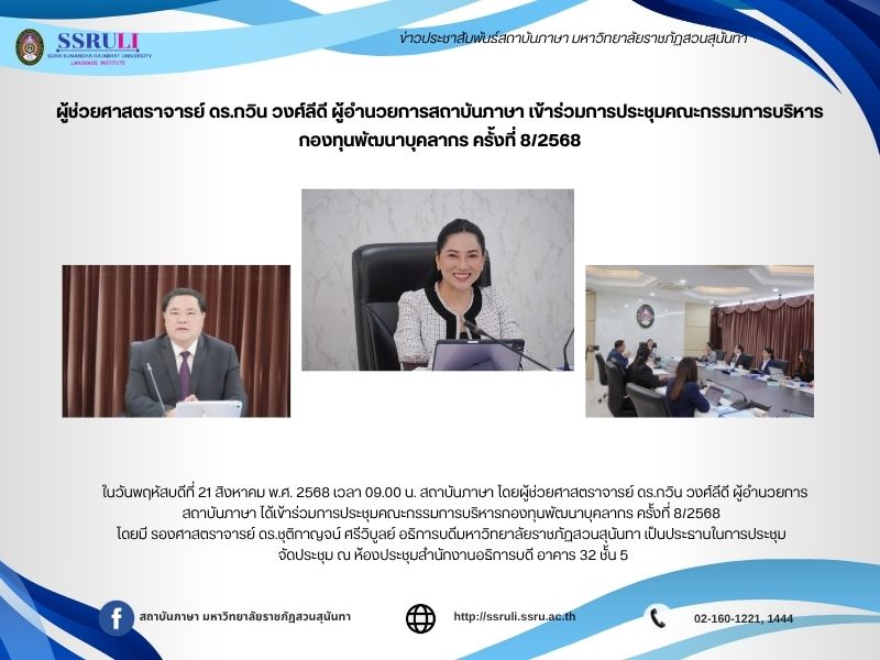 ในวันพฤหัสบดีที่ 21 สิงหาคม พ.ศ. 2568 เวลา 09.00 น. สถาบันภาษา โดยผู้ช่วยศาสตราจารย์ ดร.กวิน วงศ์ลีดี ผู้อำนวยการสถาบันภาษา ได้เข้าร่วมการประชุมคณะกรรมการบริหารกองทุนพัฒนาบุคลากร ครั้งที่ 8/2568 โดยมี รองศาสตราจารย์ ดร.ชุติกาญจน์ ศรีวิบูลย์ อธิการบดีมหาวิทยาลัยราชภัฏสวนสุนันทา เป็นประธานในการประชุม จัดประชุม ณ ห้องประชุมสำนักงานอธิการบดี อาคาร 32 ชั้น 5