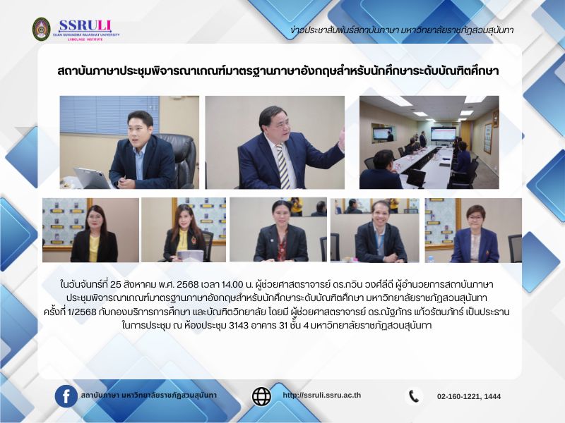 ในวันจันทร์ที่ 25 สิงหาคม พ.ศ. 2568 เวลา 14.00 น. ผู้ช่วยศาสตราจารย์ ดร.กวิน วงศ์ลีดี ผู้อำนวยการสถาบันภาษา ประชุมพิจารณาเกณฑ์มาตรฐานภาษาอังกฤษสำหรับนักศึกษาระดับบัณฑิตศึกษา มหาวิทยาลัยราชภัฏสวนสุนันทา ครั้งที่ 1/2568 กับกองบริการการศึกษา และบัณฑิตวิทยาลัย โดยมี ผู้ช่วยศาสตราจารย์ ดร.ณัฐภัทร แก้วรัตนภัทร์ เป็นประธานในการประชุม ณ ห้องประชุม 3143 อาคาร 31 ชั้น 4 มหาวิทยาลัยราชภัฏสวนสุนันทา
