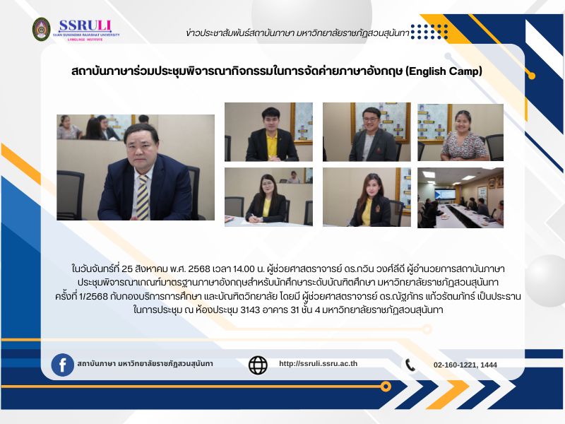 ในวันจันทร์ที่ 25 สิงหาคม พ.ศ. 2568 เวลา 14.00 น. ผู้ช่วยศาสตราจารย์ ดร.กวิน วงศ์ลีดี ผู้อำนวยการสถาบันภาษา ประชุมพิจารณาเกณฑ์มาตรฐานภาษาอังกฤษสำหรับนักศึกษาระดับบัณฑิตศึกษา มหาวิทยาลัยราชภัฏสวนสุนันทา ครั้งที่ 1/2568 กับกองบริการการศึกษา และบัณฑิตวิทยาลัย โดยมี ผู้ช่วยศาสตราจารย์ ดร.ณัฐภัทร แก้วรัตนภัทร์ เป็นประธานในการประชุม ณ ห้องประชุม 3143 อาคาร 31 ชั้น 4 มหาวิทยาลัยราชภัฏสวนสุนันทา