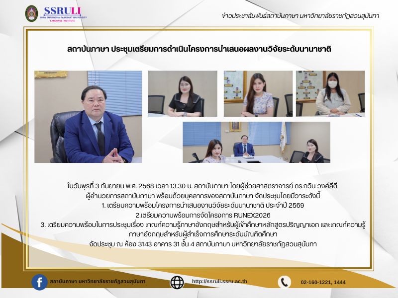 ในวันพุธที่ 3 กันยายน พ.ศ. 2568 เวลา 13.30 น. สถาบันภาษา โดยผู้ช่วยศาสตราจารย์ ดร.กวิน วงศ์ลีดี ผู้อำนวยการสถาบันภาษา พร้อมด้วยบุคลากรของสถาบันภาษา จัดประชุมโดยมีวาระดังนี้