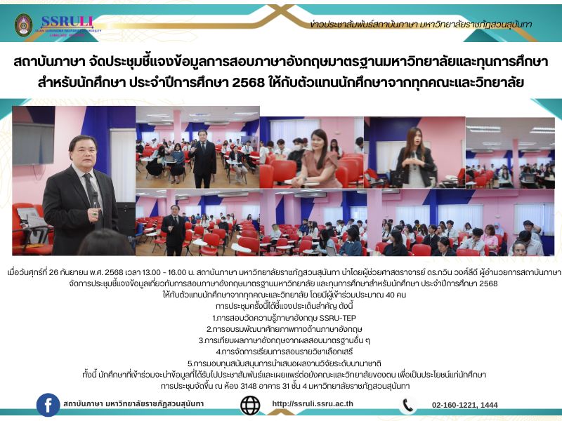 เมื่อวันศุกร์ที่ 26 กันยายน พ.ศ. 2568 เวลา 13.00 – 16.00 น. สถาบันภาษา มหาวิทยาลัยราชภัฏสวนสุนันทา นำโดยผู้ช่วยศาสตราจารย์ ดร.กวิน วงศ์ลีดี ผู้อำนวยการสถาบันภาษา จัดการประชุมชี้แจงข้อมูลเกี่ยวกับการสอบภาษาอังกฤษมาตรฐานมหาวิทยาลัย และทุนการศึกษาสำหรับนักศึกษา ประจำปีการศึกษา 2568 ให้กับตัวแทนนักศึกษาจากทุกคณะและวิทยาลัย โดยมีผู้เข้าร่วมประมาณ 40 คนการประชุมครั้งนี้ได้ชี้แจงประเด็นสำคัญ ดังนี้