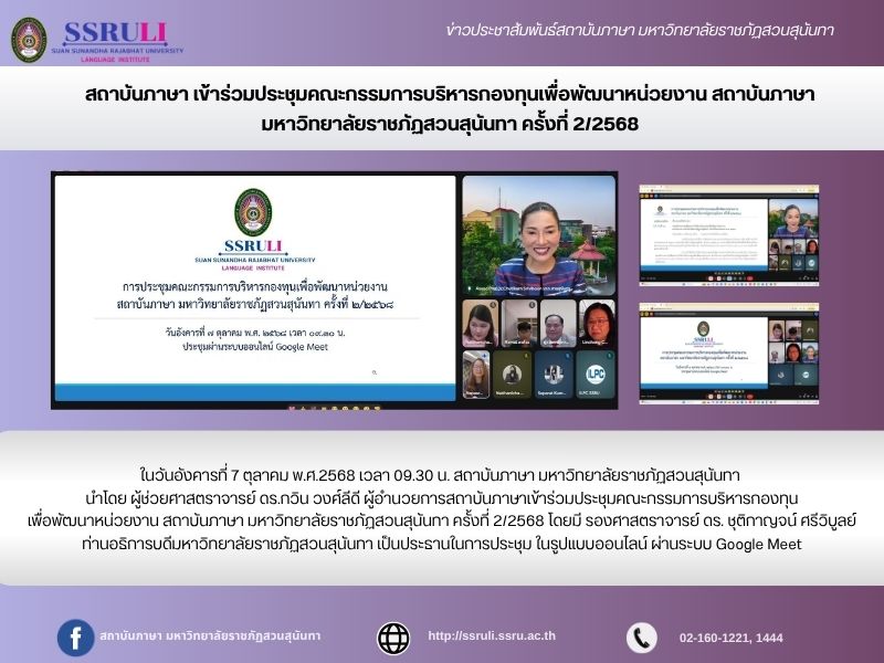 ในวันอังคารที่ 7 ตุลาคม พ.ศ.2568 เวลา 09.30 น. สถาบันภาษา มหาวิทยาลัยราชภัฏสวนสุนันทา นำโดย ผู้ช่วยศาสตราจารย์ ดร.กวิน วงศ์ลีดี ผู้อำนวยการสถาบันภาษาเข้าร่วมประชุมคณะกรรมการบริหารกองทุน เพื่อพัฒนาหน่วยงาน สถาบันภาษา มหาวิทยาลัยราชภัฏสวนสุนันทา ครั้งที่ 2/2568 โดยมี รองศาสตราจารย์ ดร. ชุติกาญจน์ ศรีวิบูลย์ ท่านอธิการบดีมหาวิทยาลัยราชภัฏสวนสุนันทา เป็นประธานในการประชุม ในรูปแบบออนไลน์ ผ่านระบบ Google Meet