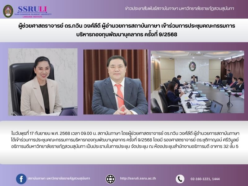 ในวันพุธที่ 17 กันยายน พ.ศ. 2568 เวลา 09.00 น. สถาบันภาษา โดยผู้ช่วยศาสตราจารย์ ดร.กวิน วงศ์ลีดี ผู้อำนวยการสถาบันภาษา ได้เข้าร่วมการประชุมคณะกรรมการบริหารกองทุนพัฒนาบุคลากร ครั้งที่ 9/2568 โดยมี รองศาสตราจารย์ ดร.ชุติกาญจน์ ศรีวิบูลย์ อธิการบดีมหาวิทยาลัยราชภัฏสวนสุนันทา เป็นประธานในการประชุม จัดประชุม ณ ห้องประชุมสำนักงานอธิการบดี อาคาร 32 ชั้น 5