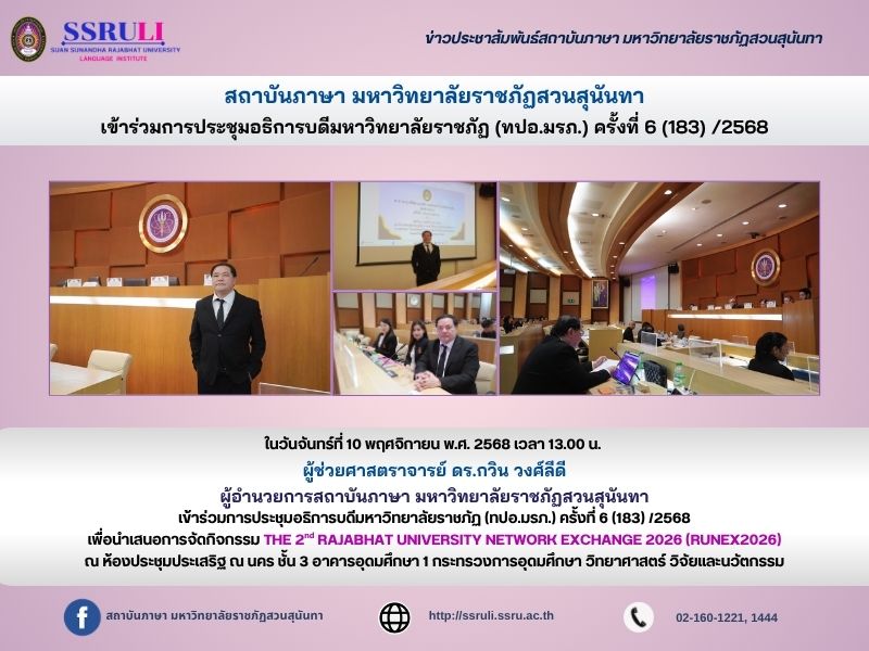ในวันจันทร์ที่ 10 พฤศจิกายน พ.ศ. 2568 เวลา 13.00 น. ผู้ช่วยศาสตราจารย์ ดร.กวิน วงศ์ลีดี ผู้อำนวยการสถาบันภาษา มหาวิทยาลัยราชภัฏสวนสุนันทา เข้าร่วมการประชุมอธิการบดีมหาวิทยาลัยราชภัฏ (ทปอ.มรภ.) ครั้งที่ 6 (183) /2568 เพื่อนำเสนอการจัดกิจกรรม THE 2nd RAJABHAT UNIVERSITY NETWORK EXCHANGE 2026 (RUNEX2026) ณ ห้องประชุมประเสริฐ ณ นคร ชั้น 3 อาคารอุดมศึกษา 1 กระทรวงการอุดมศึกษา วิทยาศาสตร์ วิจัยและนวัตกรรม
