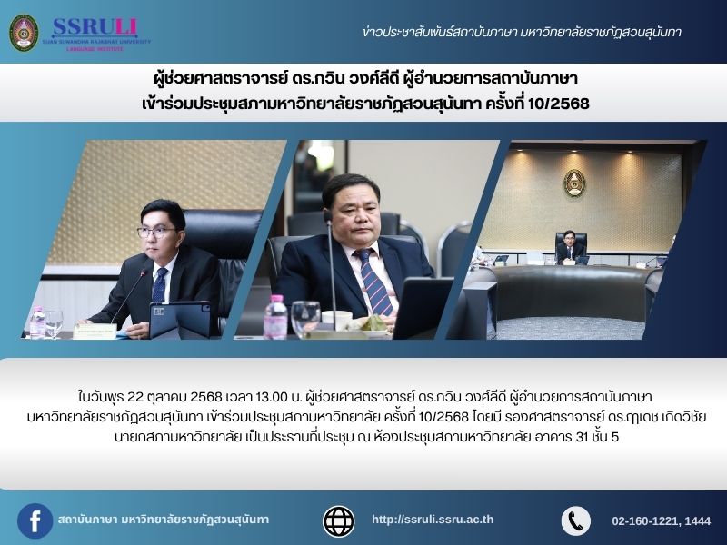ในวันพุธ 22 ตุลาคม 2568 เวลา 13.00 น. ผู้ช่วยศาสตราจารย์ ดร.กวิน วงศ์ลีดี ผู้อำนวยการสถาบันภาษา มหาวิทยาลัยราชภัฏสวนสุนันทา เข้าร่วมประชุมสภามหาวิทยาลัย ครั้งที่ 10/2568 โดยมี รองศาสตราจารย์ ดร.ฤๅเดช เกิดวิชัย นายกสภามหาวิทยาลัย เป็นประธานที่ประชุม ณ ห้องประชุมสภามหาวิทยาลัย อาคาร 31 ชั้น 5